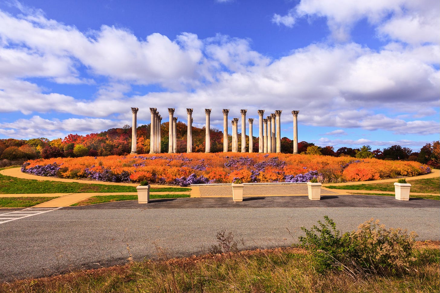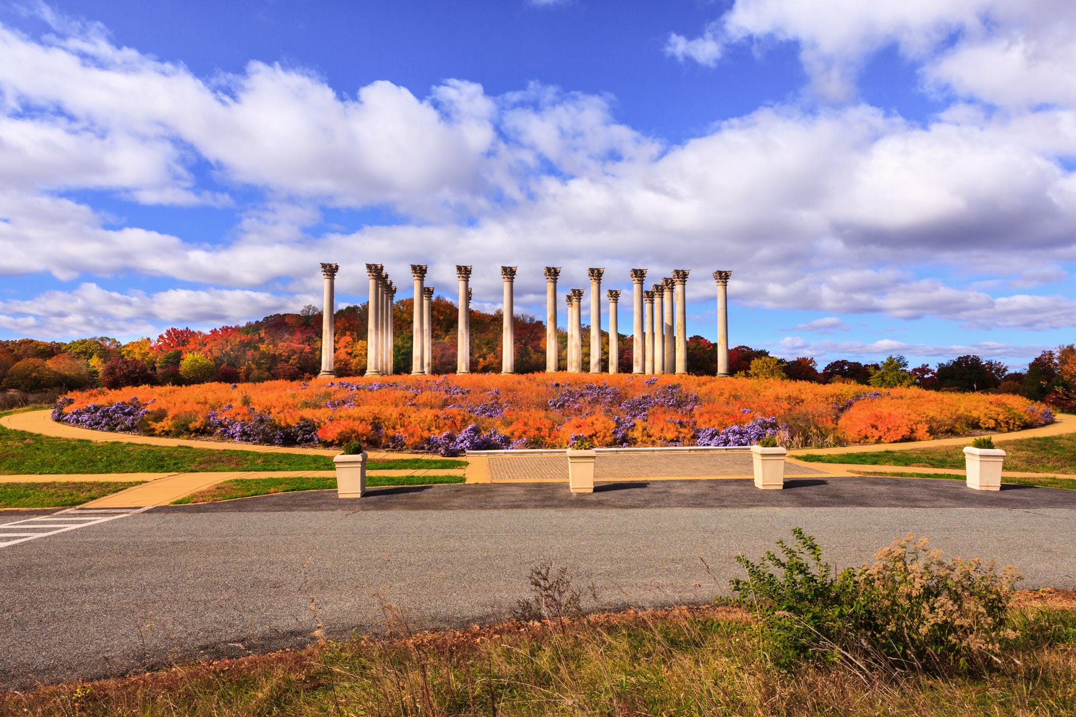 One of Washington’s most distinctive landmarks is the National Capitol Columns, which, after a challenging history, are now on display at the National Arboretum. These Corinthian sandstone pillars were originally meant to support the U.S. Capitol’s iron dome but couldn’t fulfill their purpose when a larger-than-expected cupola was built. Today, 22 of these elegant columns remain on display in an open meadow.